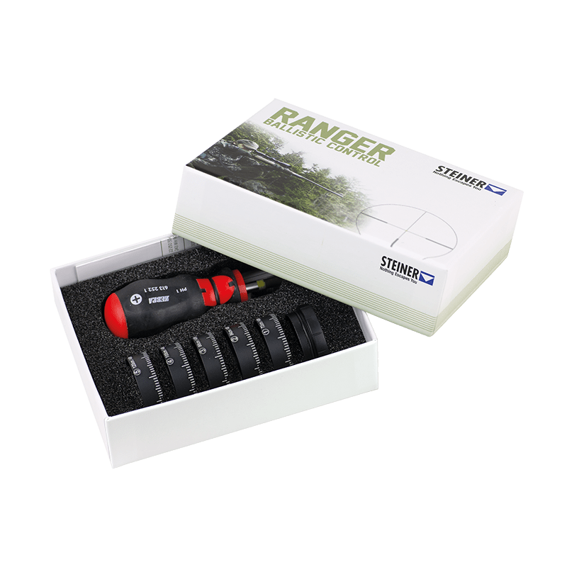Das Ballistic Control Set für die Steiner Zielfernrohr Ranger 3–12x56 und 4–16x56 besteht aus 5 unterschiedlichen ballistischen Ringen, die alle wichtigen Jagdgeschosse und -kaliber abdecken. Je nach genutztem Büchsenkaliber wird die jeweilige Kappe angebracht, die dann eine präzise Absehenschnellverstellung für einen perfekten Schuss ermöglicht.