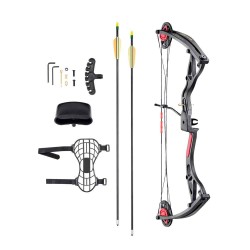 Lieferumfang: 1 Compoundbogen, 2 Pfeile, 1 Köcher, 1 Armschutz, 1 Zielscheibe.