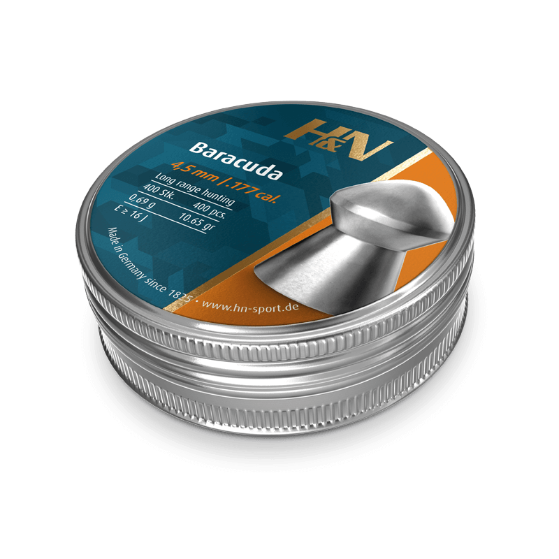Mit einem Gewicht von 0,69 g ist die Baracuda 4,5 mm eine schwere als auch sehr präzise Kugel für weite Distanzen. Erstklassiges aerodynamisches Design für hohe Durchschlagkraft und Eindringtiefe. Enge Schussgruppen. Geringste Verbleiung und gleichmäßige Schussbilder durch spezielle Legierung. Glatt.