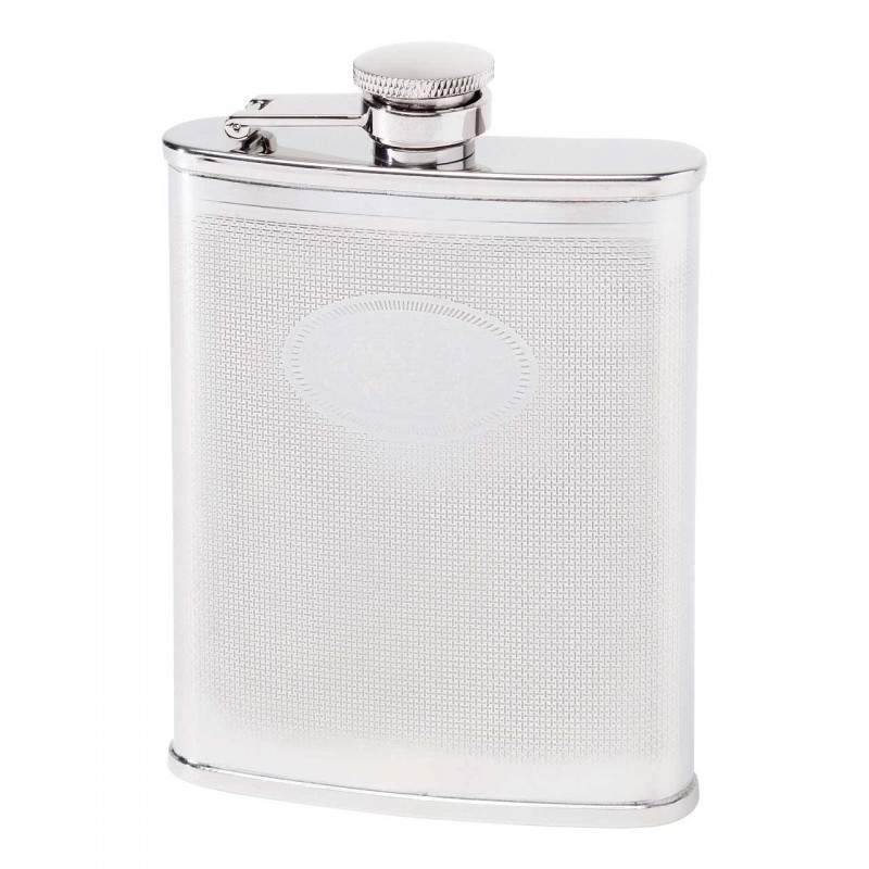 Mit einem dezenten Muster überzeugt diese Herbertz Taschenflasche. In das Edelstahlgefäß passen 177 ml. Ein Monogramm kann in der dafür vorgesehenen ovalen Fläche im oberen Bereich der Flasche graviert werden. Ein gesicherter Verschluss macht die Ausstattung komplett.