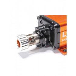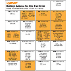 Lyman’s Case Trim Xpress gives rifle reloaders the speed and accuracy that they have been looking for when trimming cases! The unit has its own power source, and a strong variable speed motor, so there is no need to use power drills or pur- chase separate motors . By using bushings that contact on the shoulder of bottle neck type cases, the Case Trim Xpress will quickly and cleanly trim your brass by simply pushing the case against the long lasting carbide cutter . The trimmer comes with a set of 10 bushings (in orange type below) designed to fit most popular bot- tleneck rifle cases . The bushings support and center the case with the cutter . No pilots are needed! The bushings are spring loaded to provide a smooth, effortless cut; and allow the user to trim approximately 15 cases per minute . In addition, the Case Trim Xpress is equipped with an adjustment wheel, which allows case lengths to easily be “dialed in” to .001” increments . Plus the Case Trim Xpress is made with a compact, low profile housing that doesn’t eat up all of your bench space .