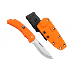 Die passgenaue Kydex-Scheide ist mit einem drehbaren Gürtelclip versehen und ermöglicht ein blitzschnelles Befestigen in verschiedenen Positonen. Dabei kann das Messer auch einhändig aus der Scheide genommen werden. Beim Einstecken rastet das Messer hörbar ein und ist so zuverlässig fixiert. Über ein zusätzliches Loch in der Scheide kann eingedrungenes Wasser sofort wieder abfließen und verhindert somit Schäden an der Klinge. Auf eine Trageöse wurde verzichtet, um das Öffnen des Schlosses mittels einem Schlag mit der Hand zu gewährleisten. Durch die gut sichtbare Farbe sind Messer und Schneide in Signalorange bei Verlust im Wald schnell auffindbar.