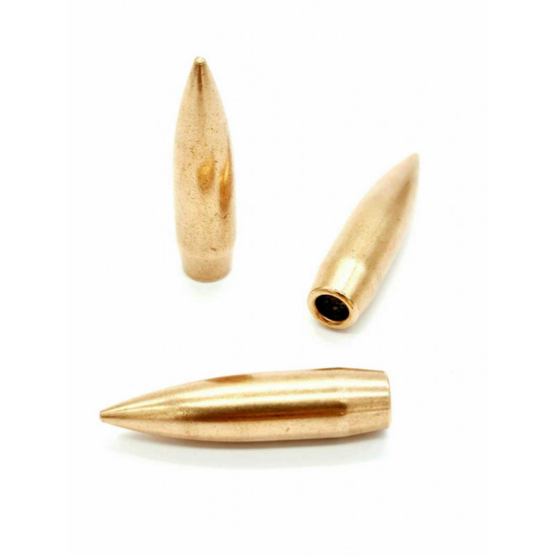 Full Metal Jacket Boat Tail (FMJ BT) bullets are specially shaped bullets to reduce air resistance. The rear cone in combination with aerodynamically shaped ogival part provides high ballistic coefficient, slight velocity drop on trajectory, greater down-range energy and less wind drift as well.