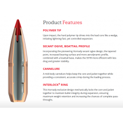 Incorporating the pioneering Hornady secant ogive design, the tapered point, increased bearing surface and more aerodynamic profile, combined with a boattail base, makes the SST® more efficient with less drag and greater stability.