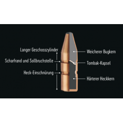 Das Doppelkerngeschoss besteht aus zwei Bleikernen unterschiedlicher Härte. Der vordere Kern zerlegt sich zuverlässig und sorgt für hohe Augenblickswirkung. Zur Steuerung dieses Deformationsprozesses trennt eine einzigartige Tombak-Kapsel den hinteren Geschosskern vom weicheren Bugkern. Das Kerngewichtsverhältnis beträgt 50:50 und garantiert so eine perfekte Mischung aus Augenblickswirkung und Ausschusswahrscheinlichkeit. Durch diese Konstruktion entsteht ein gerader Schusskanal für den wichtigen, sicheren Ausschuss.