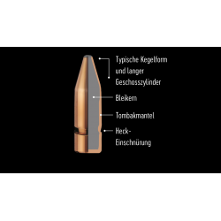 Ob starkes oder schwaches Wild – das Geschoss pilzt sich kontrolliert auf und gibt gleichmäßig Energie im Wildkörper ab unter Erhaltung eines wirksam vergrößerten Restkörpers für den Ausschuss. Das Geheimnis liegt in der optimalen Abstimmung der Mantelwandstärke und der Härte des Bleikerns. Die äußere Form des Geschosses schafft ideale Voraussetzungen für hohe Präzision und geringen Luftwiderstand.