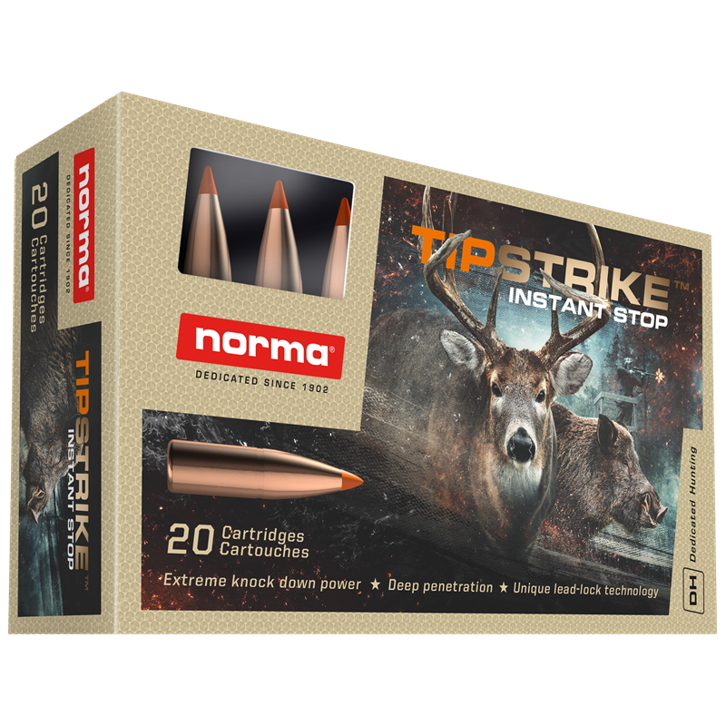 TIPSTRIKE wurde konzipiert, um maximale Stoppwirkung mit ausreichender Durchschlagskraft zu verbinden und somit die lebenswichtigen Organe des Wildes zu erreichen. Die Polymerspitze gewährleistet die Aufpilzung und sorgt durch die Konstruktion des Geschossmantels für eine effektive Durchschlagskraft. Um das Restgewicht möglichst hoch zu halten, wurde der Mantel mechanisch mit dem Bleikern fixiert. Dies macht das TIPSTRIKE zu einem herausragenden Geschoss für Drückjagden und andere Formen der Jagd, bei denen es auf hohe Stoppwirkung ankommt.