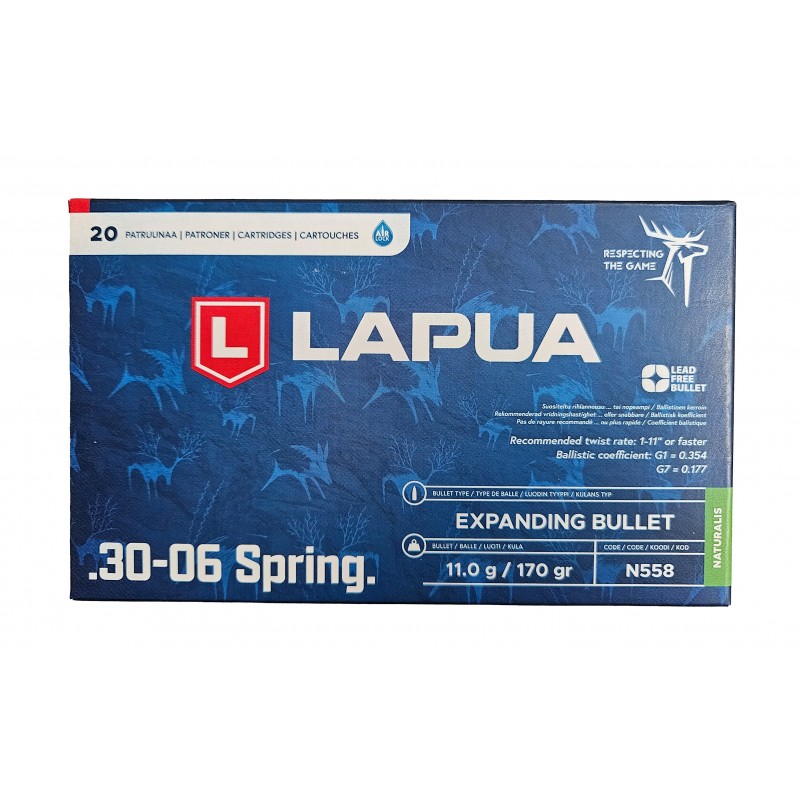 The Lapua hunting ammunition selection for the .30-06 is very versatile. No matter whether the game is hunted in the mountains or on wide open plains, the .30-06 Springfield meets the demands of big game hunting. Especially with heavy bullets, the .30-06 displays great versatility on large game, and is still a very popular hunting cartridge. As a leadfree option, we offer the 30-06 Spring. with the solid copper, 11,0 gram / 170 grain Naturalis bullet.