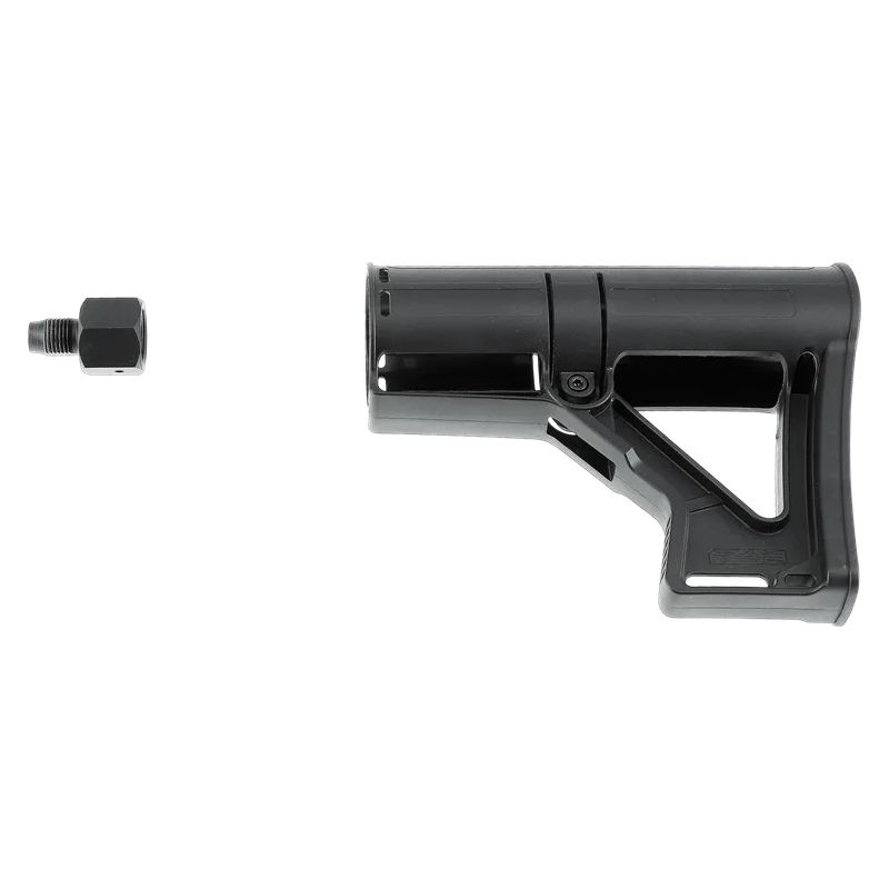 Der High Pressure Air (HPA)-Adapter ermöglicht das Umrüsten der T4E TC 68 vom Standard-CO₂-Antrieb auf den Betrieb mit 0,2l Pressluftflaschen. Das Set besteht aus einem Gewindeadapter und einer Polymer-Schulterstütze zum direkten Aufsetzen auf die HPA-Flasche.