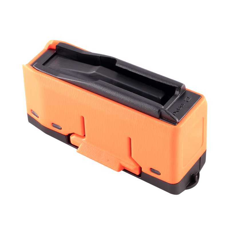 Doppelreihiges, herausnehmbares 5 Schuss Magazin, schließt unten bündig mit dem Gehäuse ab, beidseitige Auslösung verhindert unabsichtliche Magazinentnahme. Aus leichtem, stabilen Polymer und in Signalfarbe zur einfachen Identifizierung beim Herausnehmen.