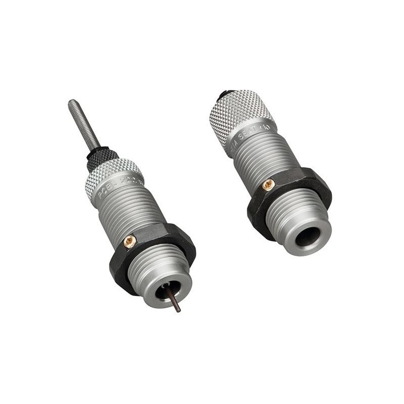 2-Matrizensets sind für Gewehr- und Pistolenhülsen mit Flaschenhals gedacht und bestehen aus einer Gesamtlängen-Kalibriermatrize mit Expander-Ausstoßereinheit und einer Setzmatrize mit Geschosssetzstecker.