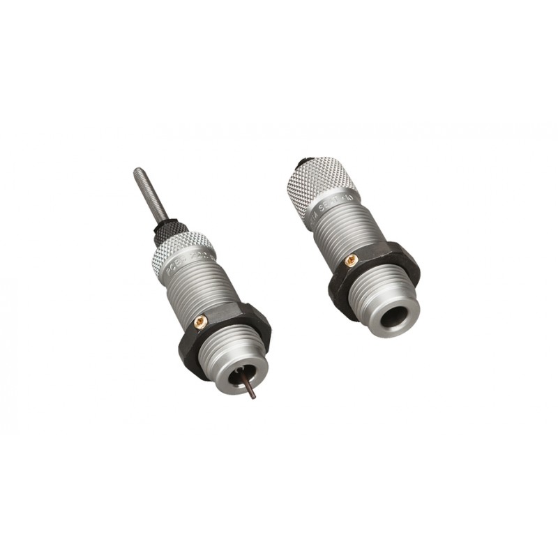 2-Matrizensets sind für Gewehr- und Pistolenhülsen mit Flaschenhals gedacht und bestehen aus einer Gesamtlängen-Kalibriermatrize mit Expander-Ausstoßereinheit und einer Setzmatrize mit Geschosssetzstecker.