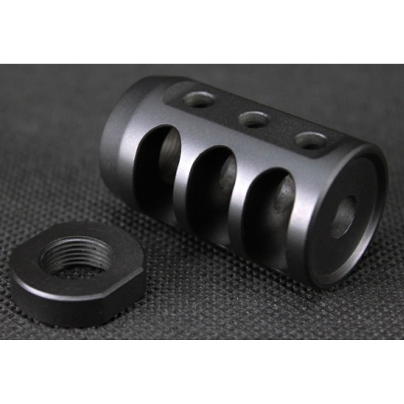 Die 22mm starke zylindrische Schraubbremse vom Typ6V3 fällt sehr kompakt aus und passt somit sehr gut zu dünneren Laufdurchmessern unter 20mm. Alle drei Kammern verfügen auf der Oberseite über eine Bohrung, die den Gasen auch das Ausströmen nach oben erlauben. So kann gezielt dem Hochschlag der Waffe entgegengewirkt werden. Der Bremse liegt eine passende Kontermutter bei, mit der die Bremse bei der Montage auf jedem Gewinde so abgestimmt werden kann, dass sie im aufgeschraubten Zustand korrekt ausgerichtet ist.