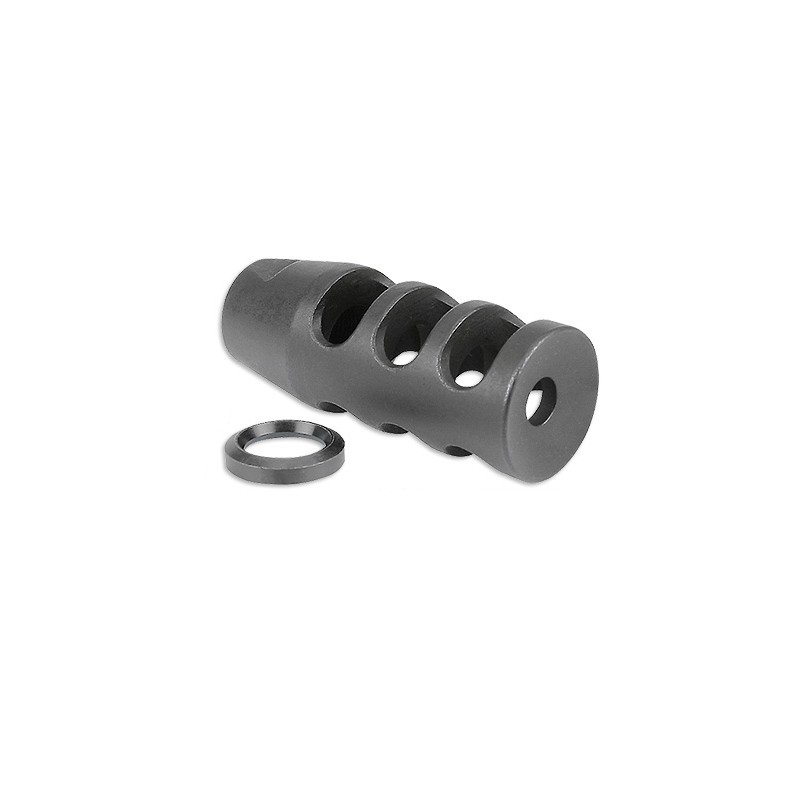 Three chamber design significantly reduces muzzle rise Constructed of tool steel with a phosphate finish 1/ 2 - 28 threads for 5.56 /.223 rifles Includes new crush washer 100% made in the U.S.A. Lifetime Warranty Weight 3.6oz