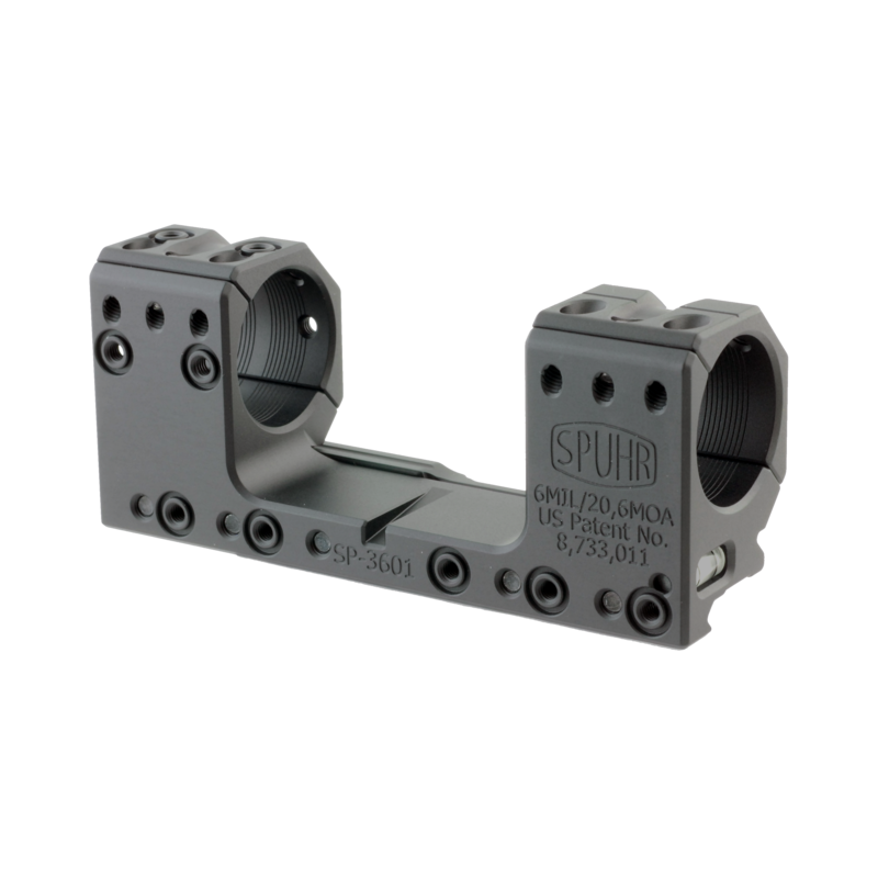 The IDEAL SCOPE MOUNT SYSTEM series of mounts feature seven set of interfaces to attach any of more than 40 different accessories, and has a bubble level integrated in the rear plane of the mount body to prevent canting of the rifle. The rings are diagonally cut for increased visibility of the elevation and windage turrets (US Patent 8,733,011). The mounts are machined from billet 7075 T651 aluminum and all aluminum parts are hardcoat anodized. The Torx 20 ring and clamping screws are zinc-nickel coated for corrosion resistance. The screws come pre-waxed from the factory to ensure proper torque values. The mount is shipped with a manual and a “wedge” leveling key.
