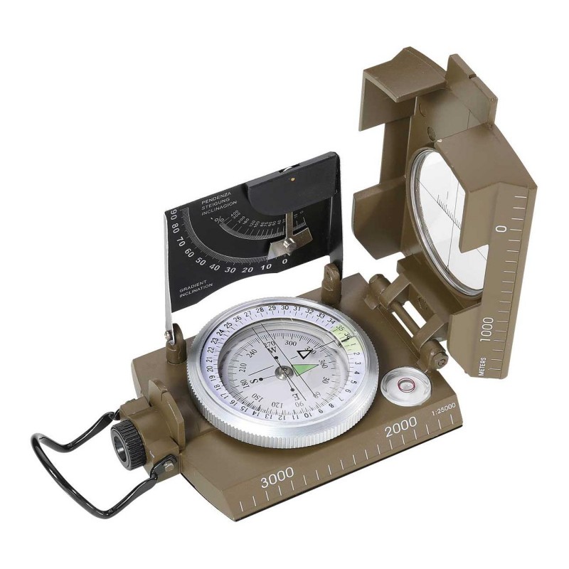 Herbertz Kompass mit zahlreichen Extras: flüssigkeitsgedämpfte Kapsel mit 360° Einteilung, Markierungen in Leuchtfarbe zur Ablesbarkeit bei Dunkelheit, Anlegekante mit Maßstabeinteilung 1:25000, Sucher mit Vergrößerungsglas, Klinometer zur Messung von Hangneigung, Metallgehäuse, integrierte Wasserwaage und Stativgewinde.