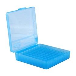 MTM originated the 100 round flip-top handgun ammo boxes over 30 years ago. The Case-Gard P-100’s are the perfect ammo carrier for the handgunner who wants to spend several hours at the range. Ideal for storing reloads. They have an easy to grip, scuff-resistant textured surface and are stackable. The Snap-Lok latch and full length mechanical hinge are guaranteed for 25 years. Calibers for each box our listed on the bottom of each box. Load label included.