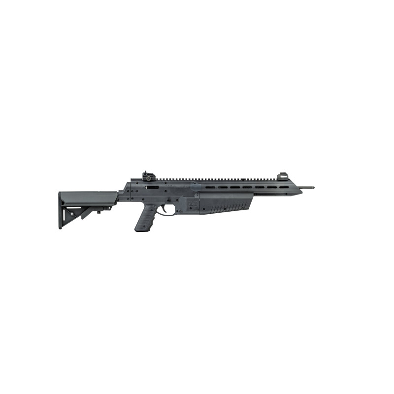 Wie gut ein solcher Hybrid aussehen kann, demonstriert das Umarex AirJavelin: Optisch erinnert es an eine Airgun im AR-15-Stil. Mit durchgehender Picatinny-Schiene und einem M-LOK-System am Vorderschaft ist es universell modifizierbar. Der Schubschaft rastet in der idealen Länge ein, und die Abdeckung der ausdauernden 88 g CO₂-Kapsel lässt sich sicher umgreifen. Bei den Geschossen kommt dann der Armbrust-Charakter zum Vorschein, denn anstelle von Diabolos greift es auf hohle Spezialpfeile zurück, die über das innenliegende Abschussrohr zielsicher beschleunigt werden.