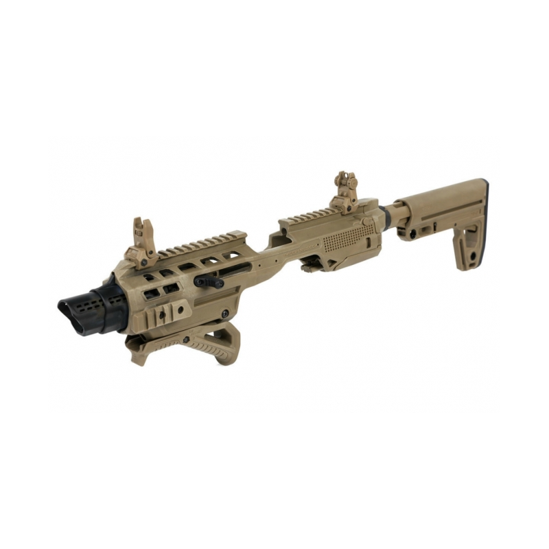 Der Kidon Kit von IMI Defense ist ein aus Polymer gefertigter, universell einsetzbarer Umrüstbausatz um schnell und einfach nahezu jede Full Size Pistole mit Schiene in eine taktische Plattform auf Picatinny Basis umzubauen. Der Kit ist mit vielen Montagemöglichkeiten ausgestattet und verfügt über diverse Einstellelemente. Ausserdem sind diverse Verstärkungen aus Metall und ein Hitzeschild vorhanden.