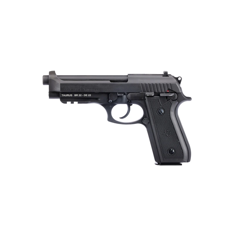 Im Jahre 1980 übernahm Taurus die Beretta Fabrik in S˜ao Paulo, Brasilien und begann sofort das Beretta Design zu überarbeiten. Das Ergebnis hieraus ist die bekannte und bei Jägern sowie Sportschützen gleichermaßen, sehr geschätzte Taurus 92. Mit dem aktuellen Modell ist Taurus ein weiterer Schritt in der Entwicklung gelungen. Der aus einer Speziallegierung neu designte Rahmen, ist extrem robust und gibt dem Schlitten einen hervorragenden Halt. Ein weiteres, neues Feature ist die beidseitig am Rahmen angebrachte 3 Positionen Sicherung. Ausgestattet mit Gummi Griffschalen liegt die Waffe sehr gut in der Hand.
