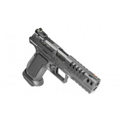 Der jüngste Spross kommt in einen Hauch von Schwarz gehüllt daher. Ihm wurde die Zulassung für die IPSC Standard Division in die Wiege gelegt. Nimmt man den eloxierten Low-Profile Magazintrichter ab, darf die 9-Millimeter-Pistole auch in der Production Klasse gewinnen. Die « Black Ribbon » bietet dem Schützen bereits beim Öffnen des Koffers ein breites Spektrum an Flexibilität: Drei 18-Schuss-Magazine, Lichtsammelkorn plus schattiertem, klickverstellbarem Visier und dazu noch Optics Ready inklusive dreier Montageplatten für die gängigsten Rotpunktvisiere.