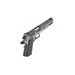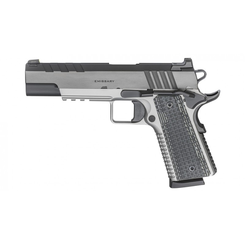 Die Emissary hat eine besondere Mission: Sie verbindet Sport- und Custom-Pistolen und ergänzt die 1911er-Familie von Springfield Armory um eine kühne und fähige Variante. Aufgebaut auf einer dauerhaften Konstruktion aus geschmiedetem Stahl in Lauf, Schlitten und Rahmen, bietet die Emissary eine Sportpistole mit einem Hauch von Custom-Raffinesse. Die Pistole hat ein schönes zweifarbiges Finish, mit einem gebläuten Karbonstahlschlitten und einem Edelstahlrahmen mit quadratischem Abzugsbügel. Ein "Tri-Top"-Schliff auf dem Schlitten verleiht der Pistole ein individuelles Styling, während ein Bullbarrel mit schwerem Profil für maximale Präzision sorgt und den gefühlten Rückstoß reduziert. Die Emissary vereint Form und Funktion nahtlos in einer sportlich ausgerichteten Waffe, die mit maßgeschneiderten Funktionen ausgestattet ist.