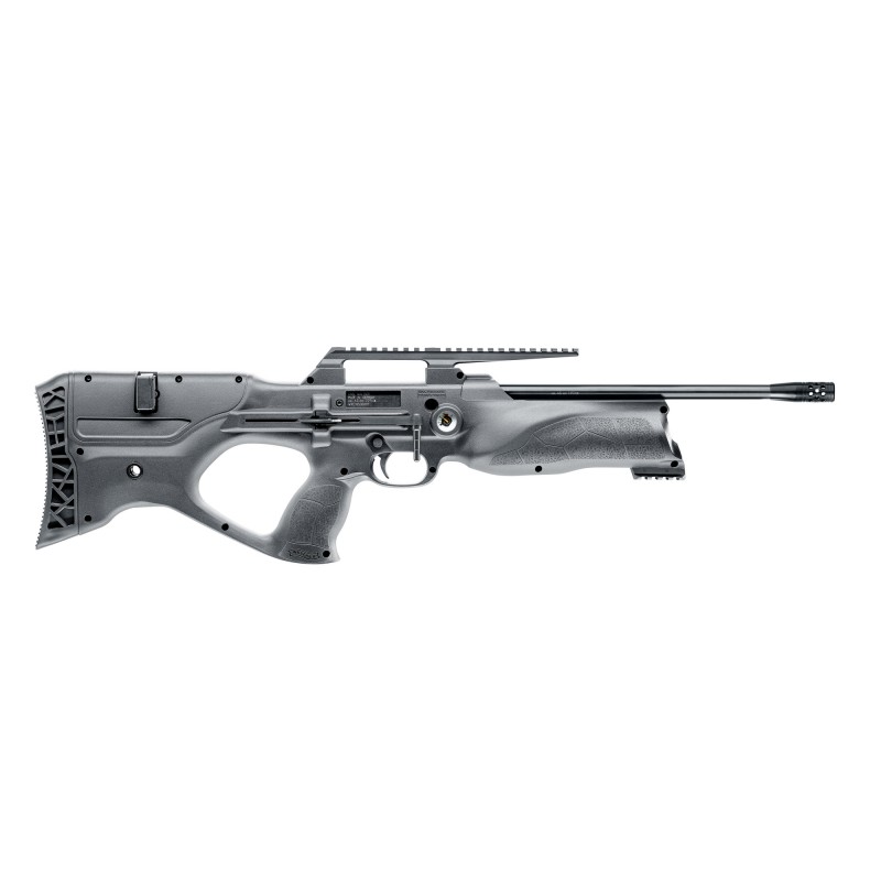 Denn hier spielt das Reign M2 L seine Stärke als Bullpup-Gewehr aus. Bei dieser Bauweise sitzt das Magazin auf Höhe der Schaftbacke und lässt so bei einer Gesamtlänge von gerade einmal 765 mm einen 600 mm langen gezogenen Lauf zu. Dieser kommt zudem aus der hochpräzisen Fertigung von Lothar Walther, ist durch seine massive Bauform besonders schwingungsarm und weist ein 1/2" UNF-Gewinde für Schalldämpfer auf. Die Energie liefert der ausdauernde 230 bar-Presslufttank mit integriertem Manometer und Quick-Fill-Adapter.