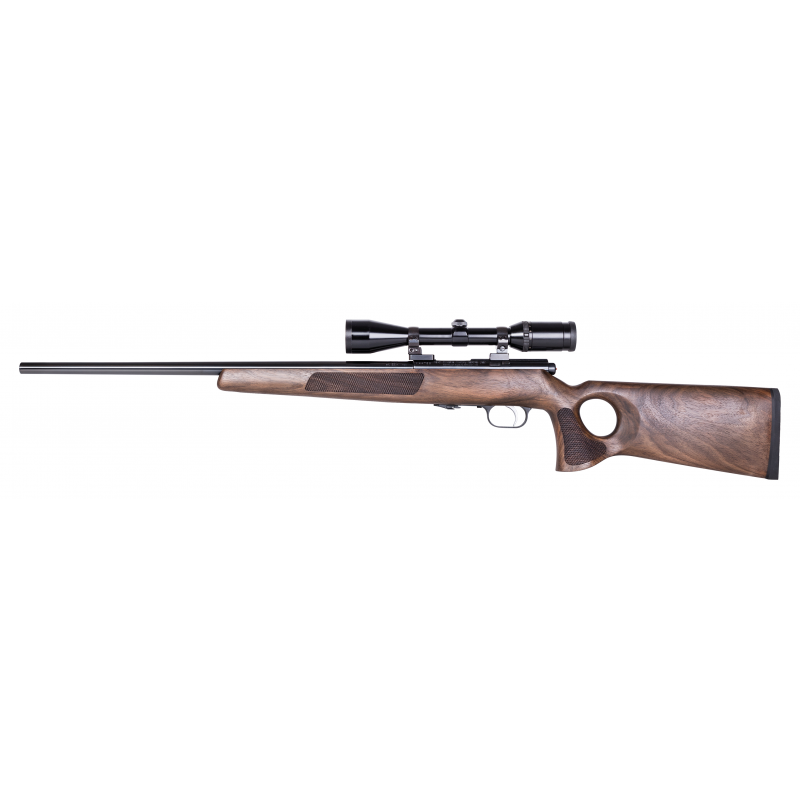 Weihrauch HW 66 Production als Allroundwaffe für das Scheibenschießen und den jagdlichen Einsatz. Schwerer, konischer Varmint-Lauf, Prismaschiene mit Zielfernrohrmontage-Löchern, bewährter Zylinderverschluss mit doppelter Verriegelung. Mit neu entwickeltem Lochschaft aus Nussbaum mit Punzierung am Pistolengriff und Vorderschaft, Gummischaftkappe.