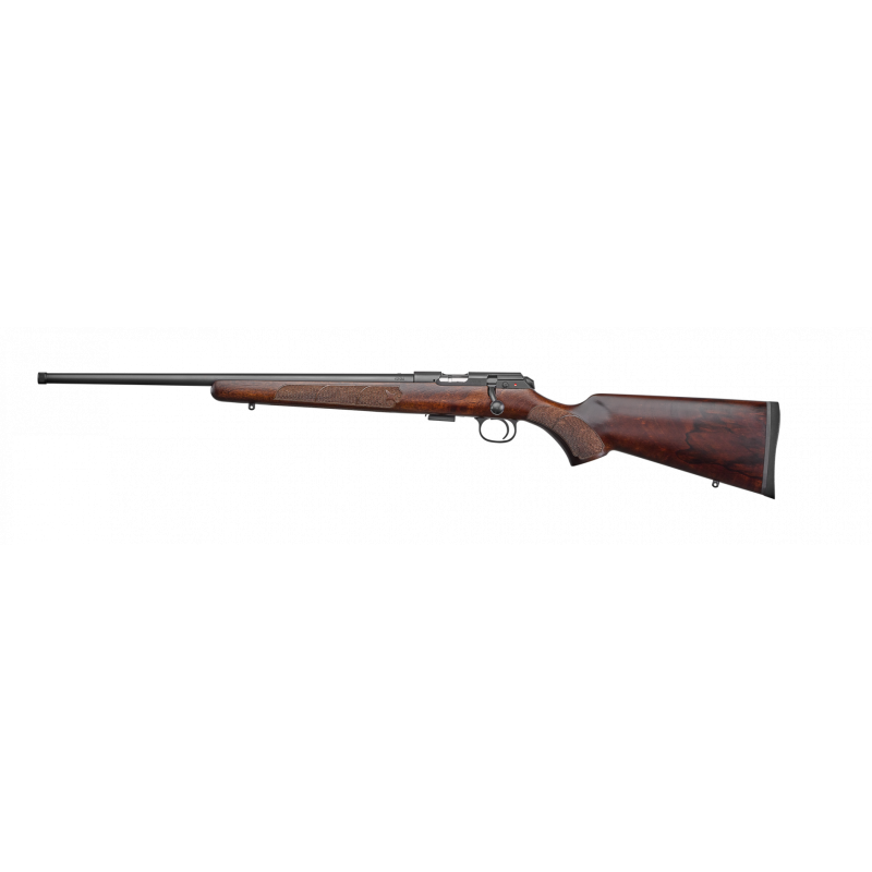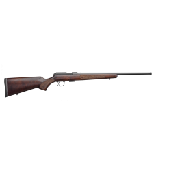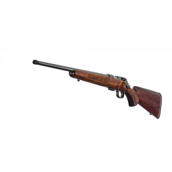 Linkshänderversion vom CZ 457 American Modell. Ein Kleinkalibergewehr, das eine Hommage an die klassischen, amerikanischen Jagd- und Sportgewehre darstellt. Der edel lackierte Schaft des American Modells wird aus hochwertigem Walnussholz gefertigt, wobei Schwalbenschwanz auf den Griff-Flächen mit einem Lilienmotiv verziert sind. Der dünnwandige, kaltgeschmiedete Lauf ist 630 mm lang und trägt kein mechanisches Visier.