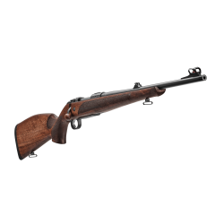 Der traditionell europäisch gehaltene Schaft ist aus ausgesuchtem Nussbaumholz gefertigt und verfügt über eine linksseitige Backe mit einer dekorativen Tropfnase aus dunkelbraunem Schichtholz. Der Pistolengriff mit Schuppenfischhaut garantiert eine komfortable und sichere Handhabung.