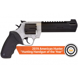 Winner of the 2019 American Hunter Handgun of the Year Golden Bullseye Award, the Taurus Raging Hunter is a next-generation, big-bore revolver that's first in innovation-and built to last. A fun and effective alternative for short- to medium-range hunting scenarios, this 44 Magnum, six-shot revolver is available in Matte Black or Two Tone finish. Its revolutionary angular barrel design cuts down on overall weight, while its factory tuned porting and gas expansion chamber reduces muzzle lift for quicker target acquisition. Cushioned insert grips ensure a comfortable, controllable shooting experience.