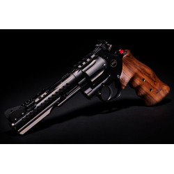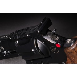 Eine Triple-Lock Verriegelung der Trommel sorgt für maximale Stabilität, besseren Schloßgang und Positionierung der Trommel. Die im Rahmen Integrierte Picatinny Rail ermöglicht eine tiefere und weit hinten liegende Montage der Rotpunktvisierung. Die Mehrpositionsvisierung ist serienmäßig mit einem Drehkorn ausgerüstet und ist in der Laufhülse integriert. Die Höhen-, Seiten- und Spaltverstellung erfolgt direkt an der Kimme. Der verlängerte sportliche Entriegelungshebel hinten links ist für Links- & Rechtshänder leicht bedienbar. Ventilierter und Taillierter Laufmantel sorgt für eine schnellere Abkühlung der Waffe bei hohen Schussfolgen und eine bessere Gewichtsverteilung.