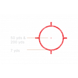Our most popular reticle offered, the 68 MOA ring with 1 MOA dot provides three usable aiming points. The aiming points above are based on the following load: .223 cal. 62 gr. 2,900 vel. When using other loads and calibers, the opera- tor will have to establish the ranges associated with the aiming points. When using a shotgun, the 68 MOA ring can be used to represent shot patterns but will vary based on choke and shell selection. For ordering this reticle, the model codes will end in -0.