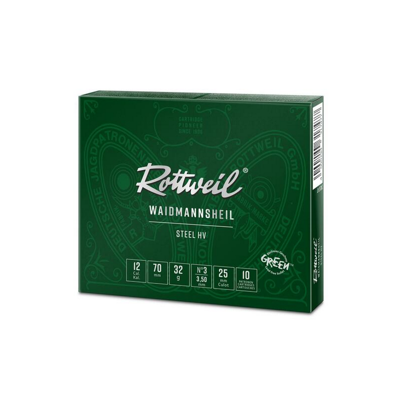 Die Rottweil Waidmannsheil Steel HV (HV = high velocity = hohe Geschwindigkeit) Schrotpatronen zeichnen sich durch herausragende Leistungen für Jäger aus, da sie Präzision und Zuverlässigkeit vereinen. Die Patrone mit bleifreiem C.I.P.-gerechtem Weicheisenschrot bietet sich besonders für umweltsensible Gelände an.