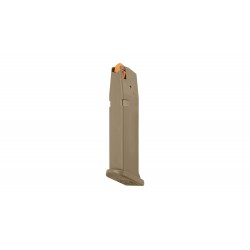 Gen5-typisch bietet auch die Schreckschuss-GLOCK einen geweiteten Magazinschacht und Front Serrations. Zusammen mit dem umsetzbaren Magazinhalter und dem beidseitigen Schlittenfanghebel garantiert sie eine schnelle Action und einen sauberen Magazinwechsel in beidseitiger Bedienung. Das Magazin selbst ist wie beim Original 17-schüssig, farblich auf das Coyote-Griffstück abgestimmt und setzt auf einen gut erkennbaren, orangefarbenen Follower. Zusätzlich stahlverstärkt und mit einer Ladestandanzeige ab dem vierten Schuss lässt es keine Wünsche offen.