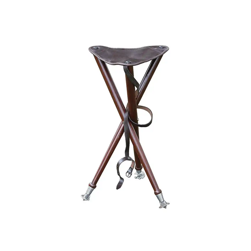 Hochwertige, robuste Verarbeitung mit Kunstleder-Einfassungen an der Büffelleder-Sitzfläche. Die Sitzfläche ist mit Nägeln/Nieten befestigt. Das Holz des Dreibeins stammt vom Zederachbaum. Inklusive Leder-Trageriemen, klappbare Metallteller und -spitzen.