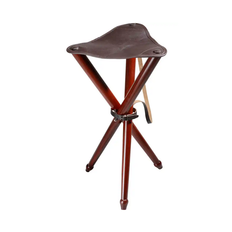 Robuste Konstruktion mit Holz-Dreibein vom Zederachbaum. Langlebige Büffelleder-Sitzfläche mit Kunstleder-Einfassungen. Die Sitzfläche ist mit Nägeln/Nieten befestigt. In traditionelle Optik mit Holzspitzen. Inklusive Leder-Trageriemen.