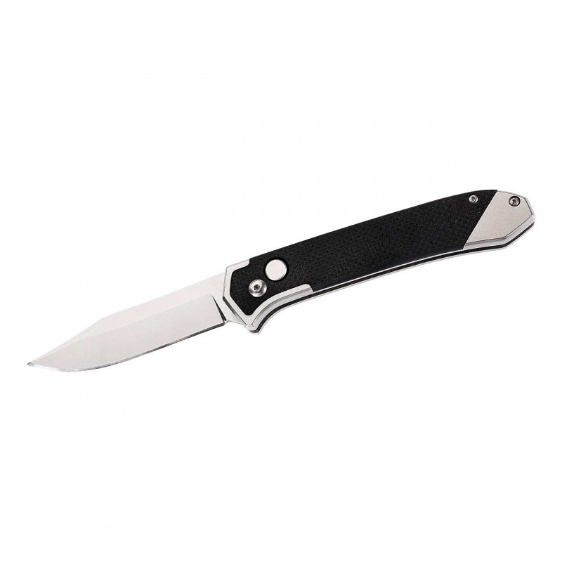 Klinge aus rostfreiem AISI 440 Stahl ist wie alle Edelstahlteile des Messers im Stone Wash Finish gefertigt. Der Auslöseknopf der Springautomatik dient gleichzeitig als zuverlässige Klingenarretierung, auch Button Lock genannt.