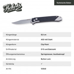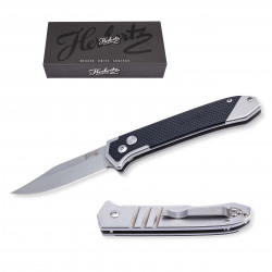Der Griff wird aus massiven Edelstahlplatinen gefertigt, welcher auf einer Seite mit einer Schale aus strukturiertem G10 versehen ist. Ein Edelstahl Taschenclip vervollständigt die Ausstattung.