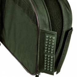 Durch den abschließbaren Doppelreißverschluss ist ein gesetzeskonformer Transport möglich. Gleichzeitig bieten die zwei aufgesetzten Reißverschluss-Seitentaschen genügend Platz, um problemlos einen Zielstock, Schalldämpfer, Fernglas oder andere Jagdutensilien aufzunehmen. Ein „Anti-Rutsch-Pad“ mit Klettverschluss am hinteren Ende verhindert, dass das Futteral in aufgestelltem Zustand verrutschen und umfallen kann. Durch die bequem gepolsterten Tragegriffe und den beiden justierbaren Rucksack- Trägern kann das Futteral entweder in der Hand oder auf dem Rücken ermüdungsfrei getragen werden.