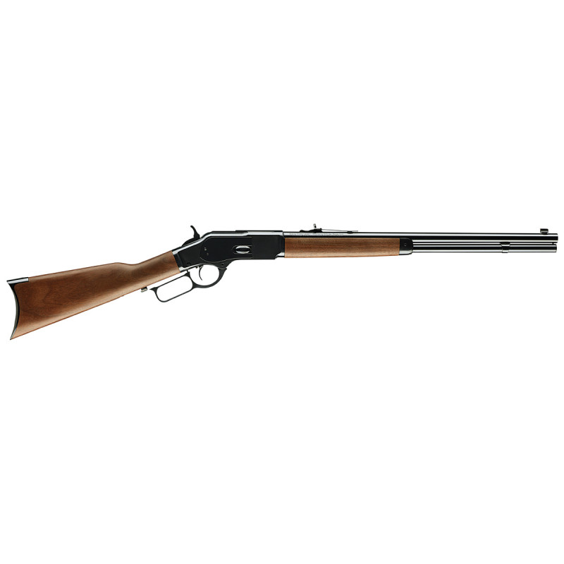 Classic configuration of the lever-action Model 1873 rifle, with straight grip stock, rifle style crescent buttplate and forearm cap, 20" round barrel, Marlble Arms gold bead front sight and semi-buckhorn adjustable rear sight.