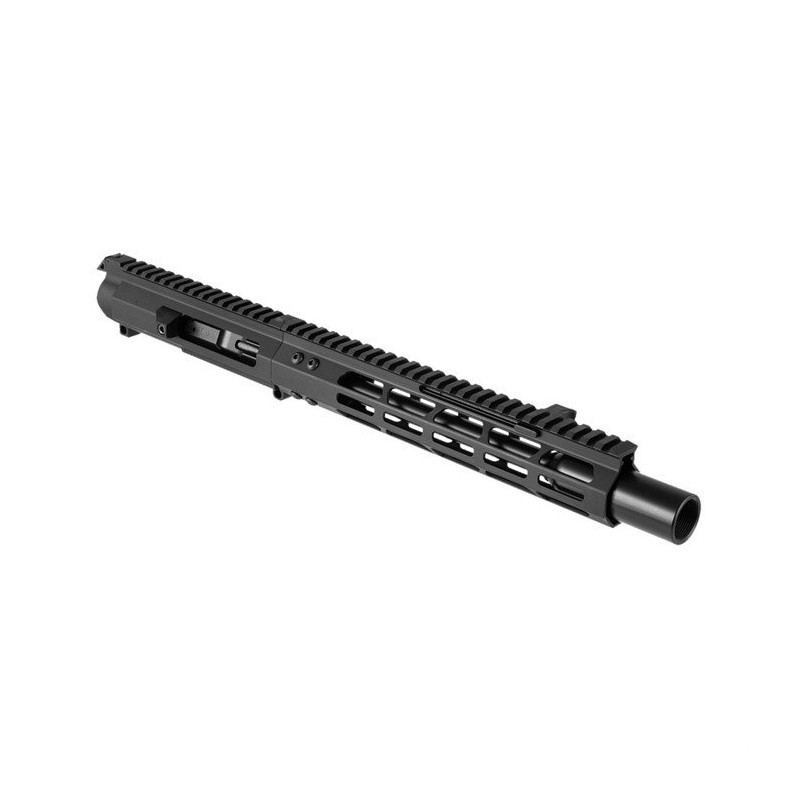Premium Melonitbeschichteter 4150 Karbonstahl Knopfgewehrlauf, 1-10 "Twist ½" -36 Gewindebohrung Beidhändig, nicht hin- und herbewegbarer Vorwärtsladegriff Bolzen- / Trägereinheit mit hartem Melonit-Finish, auch konstruiert, um zuverlässig zu funktionieren, egal welcher Hersteller Der Foxtrot Mike 9mm Upper Receiver ist so verzeihend, dass er selbst die sparsamste Munition mit Stahl-, Messing- oder Aluminiumgehäuse fahren kann.