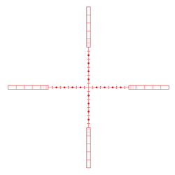 Mil-Dot Skala bei 10fach Vergrößerung. Zwischen- markierungen im 1⁄2 Mil Abstand für präzisere Haltepunkte. In Glas geätzt, frei schwebend.