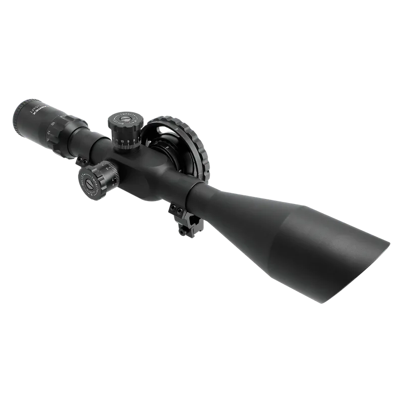 Parallaxeausgleich mit großem Schnellstellrad, großer und breiter Verstellbereich des Absehens durch hohe Türme, angewinkeltes Objektiv für ein reflektionsfreies Zielbild
